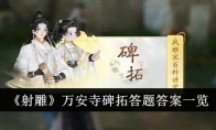 射雕万安寺碑拓答题答案是什么?射雕万安寺碑拓答题答案分享,本期为大家更新的游戏是射雕,有不少的小伙伴还不知道万安寺碑拓百科答题答案是什么,所以还不知道答案是什么的小伙伴,就可以在此和小编一起来寻找答案吧。《射雕》万安寺碑拓答题答案一览答案:312具体步骤:1、在图上可以看到所在的位置,在此进行答题即可。2、碑刻起源于何时?答案:春秋战国3、汉灵帝时期蔡邕亲自书写于碑的石刻叫做?答案:熹平石经4、从石碑上拓下来的文字叫做什么?答案:拓本以上就是3DM小编整理带来的射雕万安寺碑拓答题答案一览,更多相关游戏攻略,请关注3DM手游网!