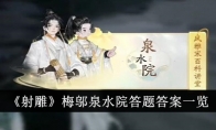 射雕梅邬泉水院答题答案是什么?射雕梅邬泉水院答题答案分享,这个答题我们需要传送到泉水院进行,很多小伙伴还不知道答案是什么,所以下面就是小编整理好的详细答案分享,还不知道答案的小伙伴,就可以在此进行参考吧。《射雕》梅邬泉水院答题答案一览答案:212具体步骤:1、首先我们需要传送到泉水院的位置,就能看到NPC进行对话即可答题。2、垂虹一景在何处?答案:玉泉山3、“玉泉垂虹”出自谁的手笔?答案:金章宗4、墨泉的泉水有何特殊用途?答案:制墨以上就是3DM小编整理带来的射雕梅邬泉水院答题答案一览,更多相关游戏攻略,请关注3DM手游网!