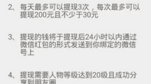 虽然派派里有很多可以获得免费红包的任务,但是想要把做任务赚取的红包拿来提前并不是那么容易的。派派对于提现也是有一些要求的,那么在派派里提现具体有哪些规则要求呢?请看下面小编带来的介绍。 提现规则介绍: 1、以后则是详细的提现规则介绍,现在派派提现需要添加好友才能成功提现哦;2、两个月以内偷够30就可以提现,如果没有提现,到第三个月的时候第一个月偷的现金就兑换钻石了;以上就是小编为大家介绍的提现规则,希望对大家有所帮助。