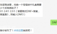 在攻坚商店里,兑换一个苍穹碎片礼盒需要多少个反物质粒子?这是地下城与勇士游戏中5月8日每日一题题目,大家清楚答案是什么吗?下面小编就给大家分享一下哦! 地下城与勇士游戏中5月8日每日一题题目题目:在攻坚商店里,兑换一个苍穹碎片礼盒需要多少个反物质粒子? 1.3个 2.4个 3.5个(答题格式DNF+答案,如答案是3,则输入DNF3)答案:DNF 2 以上就是地下城与勇士游戏中今日每日一题题目答案了,更多地下城与勇士每日一题,请关注3DM手游网,小编将持续为您更新!