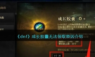 2023-05-04 阅读全文DNF是采用2D横版格斗人气网游IP原作做的一款手游,游戏中我们可以通过成长胶囊快速提高自己的等级,让自己的等级升级,但是有很多玩家发现自己领取不了成长胶囊,这是为什么呢?下面是3DM小编给大家带来的《dnf》成长胶囊无法领取原因介绍,感兴趣的小伙伴们一起来看看吧。《dnf》成长胶囊无法领取原因介绍1、等级限制:在DNF游戏中的成长胶囊领取有一定的等级限制,只有50级到109级角色才可领取成长胶囊快速提升角色等级,不再50级到109级等级范围内的玩家无法领取成长胶囊;2、暂无成长胶囊可领取:满足成长胶囊领取等级的用户,仍然无法领取成长胶囊,可能是因为目前暂无成长胶囊可领取,可以等待一段时间再尝试领取;成长胶囊将在每周四凌晨6点重置,可在重置后查看有无可领取的成长胶囊;3、成长胶囊领取方法:①打开游戏的系统菜单,