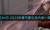 《dnf》游戏中2023年春节套礼包即将在1月份上线,本次礼包包含新年服饰套装选装礼盒,新年宠物装备选装礼盒,新年光环选装礼盒,新年特宝珠选装礼盒,新年宠物宝珠神秘礼盒等,那么今天小编就给大家介绍一下dnf2023年春节套礼包内容一览,有需要的小伙伴不要错过了。 《dnf》2023年春节套礼包内容一览新春礼包内容: 装扮自选礼盒 光环自选礼盒 普通:攻击强化5%/Buff量3%、1-35级技能等级+1。至尊:攻击强化7%/Buff量5%、1-95级技能等级+1。宠物自选礼盒、宠物装备自选礼盒 称号自选礼盒 普通:四维100、三攻65、双暴12%、三速3%、全属强20、攻击强化20%、三觉被动+1。至尊:四维120、三攻70、双暴15%、三速4%、全属强25、攻击强化28%、三觉被动+1。宝珠自选礼盒、收集