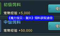 《魔力宝贝:复兴》在游戏中冒险者将会面对到很多材料,其中饲料可增加宠物经验值,目前有三个规格,初级饲料只能增加5000宠物经验,中级可增加50000宠物经验,高级饲料可增加500000宠物经验。下面是3DM小编给大家带来的《魔力宝贝:复兴》饲料获取途径分享,感兴趣的小伙伴们一起来看看吧。>>>>《魔力宝贝:复兴》资源获取攻略大全 《魔力宝贝:复兴》饲料获取途径饲料增加宠物经验值作用: 初级饲料只能增加5000宠物经验,中级可增加50000宠物经验,高级饲料可增加500000宠物经验。获取途径: ①日常活动:公会盛宴、挂机、历练②其他:公会商店、交易 以上就是3DM小编整理带来的《魔力宝贝:复兴》饲料获取途径分享,更多精彩内容,请点击关注3DM手游网!