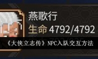 大侠立志传NPC入队怎么交互?大侠立志传里面很多人都放里面的NPC入队了,但是看到有些东西还没有交易过来了,就怕后面入队了任务线就断了,所以还是比较的疑惑了,就怕影响后面的剧情了,那么不会的来看看吧!《大侠立志传》NPC入队交互方法像交易,请教,学艺这些互动是入队后还能够触发的,在人物界面里。时间的话不用担心,除了明确指定限期的任务,比如有人约你明日子时相见,有人叫你十天之内如何如何这些任务以外,其他任务都可以无限拖,悠闲地玩就好了。一个是放在家园或队伍里面还可以购物之类的(还有个妙用就是你要刷采集可以把铁匠带着或扔家园,工具坏了买起来快)还要就是可以让npc回原来的位置以上就是3DM小编整理带来的大侠立志传NPC入队交互方法,更多相关游戏攻略,请关注3DM手游网!