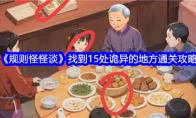 《规则怪怪谈》诡异聚餐本关的通关目标是找到15处诡异的地方,玩家需要注意部分点位的点击顺序,有很多小伙伴对此还不太清楚,接下来就让小编为大家介绍一下吧。规则怪怪谈诡异聚餐怎么过1、先点击墙上的抓痕和裂痕,点击右下角小孩的脚。2、点击熄灭蜡烛,点击墙上挂着的老人遗像。3、然后点击贡盘上的橘子、女孩的脸和桌上的食物。4、最后根据下图补齐所有诡异之处即可过关。以上就是3DM小编整理带来的《规则怪怪谈》诡异聚餐通关攻略,更多相关游戏攻略,请关注3DM手游网!