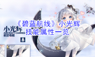 碧蓝航线小光辉技能是什么?很多小伙伴不知道碧蓝航线小光辉技能是什么。《碧蓝航线》是一款即时海战的二次元手游,以少女养成为主要玩法,游戏中有着良好的社交环境,游戏画风清新可爱,玩法丰富多彩,有着良好的海战体验。下面小编给大家带来《碧蓝航线》小光辉技能属性一览,希望能帮助到小伙伴们哦。 《碧蓝航线》小光辉技能属性一览小光辉120级数值 护甲 重耐久5946航空380防空266装填110命中85机动53幸运44航速30战斗机效率 125% +2战斗机效率125% +2鱼雷机效率 120% +1技能 舰载机,出击! 自身空袭时有40.0%(满级70.0%)概率触发,使用剑鱼进行额外一轮航空弹幕攻击Lv.1(满级Lv.10)(威力和样式依据技能等级)圣光之愿 战斗开始后12秒,使用圣光之力进行一次攻击Lv.1(满级Lv.