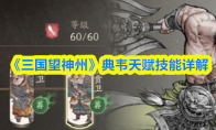 《三国望神州》典韦天赋技能详解来了!(典韦)的核心机制围绕天赋“万夫不当”与技能“折冲御敌”展开,能在3-4格内通过分摊伤害触发无限次“追击”。其技能“飞戟”提供远程驱散与破防,是攻坚利器。合理运用援护与反击体系,能使他成为队伍中可靠的防御核心与副C。>>>《三国望神州》吕玲绮图文攻略及一图流 >>>《三国望神州》夏侯惇图文攻略及一图流 >>>《三国望神州》张飞图文攻略及一图流 >>>《三国望神州》张辽图文攻略及一图流 >>>《三国望神州》貂蝉图文攻略及一图流 >>>《三国望神州》曹操图文攻略及一图流 >>>《三国望神州》典韦图文攻略及一图流 《三国望神州》典韦天赋技能详解一、角色天赋
