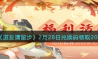 2023年3月23日道友请留步兑换码是赤魇幻化。《道友请留步》是一款绝对颠覆的神话修仙卡牌手游,游戏自上线以来发送了很多礼包码,长期兑换码,短期限时兑换码都有,礼包码都是一次性的,可以使用兑换码去领取不少资源!道友请留步兑换码3月23日2023年礼包激活码还没有领取的朋友速来吧!>>>>>小编推荐:《道友请留步》礼包兑换码大全2023最新 《道友请留步》3月23日兑换码领取2023兑换码:赤魇幻化(有效期至3.28) 兑换码在哪里输入1、登录游戏,通过游戏主界面左上角【活动】入口。2、点击活动界面顶部最右侧第一个活动为【礼包兑换】界面。3、在礼包兑换界面,输入礼包码,点击【兑换】按钮。4、 完成以上操作,即可获得礼包奖励道具!以上就是道友请留步兑换码3月23日2023年,202