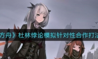 明日方舟杜林悖论模拟怎么打?《明日方舟》游戏中杜林是二星级干员,那么他的悖论模拟关卡针对性合作怎么打呢?今天小编就给大家介绍一下明日方舟杜林悖论模拟针对性合作打法攻略。《明日方舟》杜林悖论模拟针对性合作打法攻略一、关卡介绍 【针对性合作】解锁方式:升到30级为了在任务时达成更好的配合效果,行动组A4的训练有时也会邀请其他干员参加,特别是在针对杜林的训练场合-老组员将教导新人学会怎样揪住偷懒的杜林,并巧妙地监督她完成自己的工作。请注意:为达到训练效果,干员杜林应考虑被配置于最难以偷懒的位置。二、技能选择 杜林无技能,不用选。三、打法流程 1.如图所示摆放干员,12F向右,安赛尔向下,杜林向上。这里要让杜林承伤,因为她有50%的法术闪避被动效果,其他人都扛不住四个飞机的狂轰乱炸。2.因为我们这里杜林是向上放的,所以