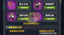 玩家可通过点击右下方功能集合中的装备图标,进入装备背包界面。 装备背包分为两部分,一部分是已经拥有的装备,一部分是装备碎片。 【拥有装备】 在拥有装备界面,玩家可以看到所有已获得的装备,包括武器,衣服,裤子,鞋子等。提升装备的途径有两个: 强化和精炼(精炼需要等级达到30级解锁)。玩家可以点击强化按钮,进入装备强化界面,也可以点击装备图像或属性显示处,查看属性详细信息,并直接选择强化、精炼,同时也可以随时选择更换装备或者卸下装备。不过要注意的是强化需要消耗一定数量的金币,精炼需要消耗精炼石。当然不需要的或被卸下的多余装备还可以选择性出售,出售可以获得一定数量的金币。【装备碎片】 在装备碎片界面中,玩家可以看到已拥有装备的碎片数量及需要合成的数量。当碎片足够时,便可合成整件装备,已合成的装备显示在【拥有装备】界面