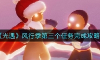 《光遇》游戏中风行季即将开启,其中的第三个任务是将被白鸟带走的乐钟拿回来。那么今天小编就给大家介绍一下光遇风行季第三个任务完成攻略,有需要的小伙伴不要错过了。相关推荐:《光遇》风行季上线时间介绍 《光遇》风行季第三个任务完成攻略 将被白鸟带走的乐钟拿回来。 第三个任务需要玩家们收集一些移动的道具;不知道玩家记不记得霞谷鲲叫先祖,第三个任务和它差不多,是收集地图内可移动的道具。当然,任务没有想象中那么恐怖,大多数都是停留在固定位置,移动速度很缓慢。只是数量比较多,建议多名玩家同时收集。分布地点:主岛、前方云洞、后方小岛。 主岛那边的碎片是有三个,位置啥的都是固定的,剩下来的两个地方的碎片都是在半空中的,找起来的话会有些难度的。如果你自己完成不了,可以找几个朋友,一起来收集,因为这个是可以共享的,所以别人也能帮助