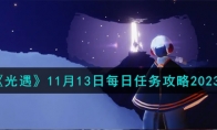 光遇是一款十分治愈的手游,其中光遇每天都会刷新四个日常任务,玩家完成日常任务即可获得蜡烛奖励,下面小编就给大家带来了光遇11月13日每日任务攻略,希望对感兴趣的玩家有所帮助,大家一起看一看吧。 光遇11月13日每日任务怎么做一、今日任务 「向一位玩家鞠躬」面向任意玩家做鞠躬动作「在禁阁重温先祖的美好回忆」禁阁一层四人门内「拯救一只遥鲲」烧掉困住遥鲲的花「在禁阁神坛冥想」在禁阁一层过了双人门再往前走一点的石碑前光圈处打坐并冥想二、任务攻略 今日任务攻略如下: 以上就是3DM小编整理带来的《光遇》11月13日每日任务攻略2023,更多相关游戏攻略,请关注3DM手游网!