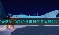 光遇是一款十分治愈的手游,其中光遇每天都会刷新四个日常任务,玩家完成日常任务即可获得蜡烛奖励,下面小编就给大家带来了光遇10月10日每日任务攻略,希望对感兴趣的玩家有所帮助,大家一起看一看吧。 光遇10月10日每日任务怎么做一、今日任务 「和朋友击掌」字面意义,也可和集结季向导完成「在云野重温先祖的美好回忆」云野图一左边半球形小山包「收集30点烛光」「收集绿色光芒」云野右侧隐藏图每个整十分绿光会被丢下二、任务攻略 今日任务攻略如下: 以上就是3DM小编整理带来的《光遇》10月10日每日任务攻略2023,更多相关游戏攻略,请关注3DM手游网!