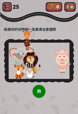 最强烧脑王是一款微信上的解谜游戏,玩家需要完成关卡的题目才能通关。该游戏第25关的题目是:给森林的动物拍一张高清全家福照。这个题目要怎么完成呢?微信最强烧脑王第25关攻略 答案:把猪移出相框,把鹿全部放进相框内,然后拍照。