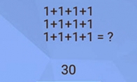 这个1加1加1,其实就是弄一个盲点,其实第一行最后的1和第二行的1是一起,也就是11,所以加号的等式里有两个11,最后算出来的结果是30。 1+1+1+1脑洞大挑战怎么过 注意看题目的等式,有两个是11哦,最后等于30.