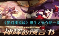 梦幻模拟战游戏的全新版本神辉的预言书即将要上线,届时将会有一名全新的英雄降生之光出现。相信还有很多小伙伴不清楚降生之光的天赋职业技能,下面小编就给大家带来梦幻模拟战新英雄降生之光天赋职业技能的介绍,感兴趣的小伙伴不要错过啦。 降生之光介绍一览天赋: 【裁决威光】 造成伤害提升(5%,8%,11%, 15%)。技能造成伤害后冷却时间减少,减少的数值为当前技能命中的敌军数量(最大减少3回合)。进入战斗前和行动结束时,获得[威光]:智力提升5%,可 累积最高可以累积(2,3,3,4)个,无法驱散。自身每拥有2个[威光],部队射程+1。 阵营 光之起源、光辉军团、梦幻转生 职业路线 初始职业光之子 [火球] : [魔法伤害]攻击单个敌军,造成1 .5倍伤害,对「步兵」有特效。[冰冻] : [魔法伤害]攻击单个敌军,造成