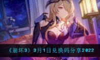 崩坏3的官方会不定期发放一些兑换码供大家领取奖励,很多小伙伴都很想知道最近新发布的3月1日兑换码内容是什么,今天小编给大家带来了《崩坏3》3月1日兑换码分享,感兴趣的小伙伴一起来看看吧。《崩坏3》3月1日兑换码分享无瑕之钥礼包:UA6LLQYRZBMT礼包内容金币*20000、体力药水*2、特级学习芯片*3兑换时间有效期至2022年3月5日0:00小贴士:同名礼包每个账号仅限领取一次,兑换码有使用期限,请舰长尽快领取!以上就是小编整理的关于《崩坏3》3月1日兑换码分享的全部内容,更多游戏攻略请持续关注3DM手游网!