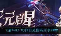 崩坏3的官方会不定期发放一些兑换码供大家领取奖励,很多小伙伴都很想知道最近新发布的3月3日兑换码内容是什么,今天小编给大家带来了《崩坏3》3月3日兑换码分享,感兴趣的小伙伴一起来看看吧。《崩坏3》3月3日兑换码分享无瑕之钥礼包:UA6LLQYRZBMT礼包内容金币*20000、体力药水*2、特级学习芯片*3兑换时间有效期至2022年3月5日0:00小贴士:同名礼包每个账号仅限领取一次,兑换码有使用期限,请舰长尽快领取!以上就是小编整理的关于《崩坏3》3月3日兑换码分享的全部内容,更多游戏攻略请持续关注3DM手游网!