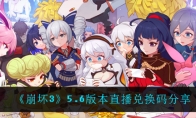 崩坏3最近开启了5.6版本直播。很多小伙伴都很想知道5.6版本直播兑换码是什么,今天小编给大家带来了《崩坏3》5.6版本直播兑换码分享。感兴趣的小伙伴一起来看看吧,希望可以帮助到大家。《崩坏3》5.6版本直播兑换码分享无光遗址礼包:JA7LLRY8HSP7礼包内容:金币*20000、高级进化材料箱*2、双子灵魂结晶*3注:同名礼包每个账号仅限领取一次,有效期至2022年3月13日0:00,请舰长尽快领取!5.6版本将上线帕朵菲莉丝SP角色「空梦·掠集之兽」、全新武器类型「环刃」等等。以上就是小编整理的关于《崩坏3》5.6版本直播兑换码分享的全部内容,更多游戏攻略请持续关注3DM手游网!
