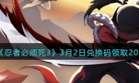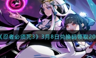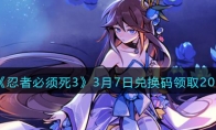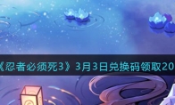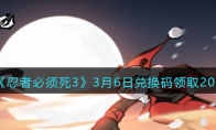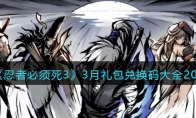 《忍者必须死3》是一款非常火爆的忍者横版动作手游巨作,游戏中大家可以通过礼包兑换码兑换福利,这是大家每日获取额外资源的重要途径,每天的激活码礼包都是不一样的呢,2023年3月8日最新兑换码是什么呢?下面是小编给大家带来的忍者必须死3兑换码3月8日2023年,忍三2023.3.8礼包激活码领取分享,想要领取福利的小伙伴一起围观领取吧!>>>>小编推荐:《忍者必须死3》兑换码大全2023>>>>小编推荐:《忍者必须死3》兑换码大全2022《忍者必须死3》3月8日兑换码领取2023兑换码:家族联赛巅峰对决每个兑换码只能使用一次,已经兑换过的伙伴不用再次使用了!礼包码领取方法地址:1、网页领取地址是:http://statistics.pandadastudio.com/
