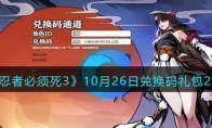 《忍者必须死3》2022年10月26日兑换码是:科学怪熊闪亮登场、小椒的百草园之旅。忍者必须死3是一款非常火爆的忍者横版动作手游巨作,极致精美的画面制作,细腻的场景刻画,将横版跑酷和忍者冒险完美融于一体,更有高潮迭起的剧情,游戏上线以来官方、B站、公众号等不定时会有各种礼包发放,今日礼包兑换码已经发放,想要领取福利的小伙伴一起围观领取吧!>>>>小编推荐:《忍者必须死3》兑换码大全2022《忍者必须死3》10月26日兑换码礼包2022兑换码:科学怪熊闪亮登场兑换码:小椒的百草园之旅数量有限,先到先得~礼包码领取方法地址:1、网页领取地址是:http://statistics.pandadastudio.com/player/giftCodeView(苹果用户只能网页领取!)2、使用安卓设