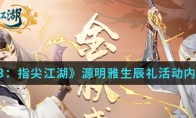 在剑网3指尖江湖手游中源明雅生辰礼活动有什么内容呢?[星星]侠客【源明雅】生辰礼即将到来,做任务可获取侠客蓝色品质突破卡和好感度~那么想知道源明雅生辰礼活动内容的就跟随小编一起来看看吧。源明雅生辰礼活动内容介绍:活动时间:8月31日维护后-9月7日维护前活动内容:1、少侠参与[第一赛季]卡池寻访十连抽必出2张或2张以上紫色品质突破卡,其中1张必为[源明雅];2、科举试题题库替换为[源明雅]相关问答, 根据答对题目的数量,少侠可获取不同层级的[源明雅]好感度;3、 [委派]将新增[源明雅]单人派遣任务,少侠可获取不同层级的[源明雅]好感度;4、每日为[源明雅]释放一次[真橙之心] , 即可获赠[源明雅]蓝色品质突破卡! ( 每日只可完成1次噢~ )5、除了以上活动之外,更有隐藏好礼等待少侠前往探索,少侠满足触发条