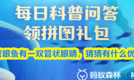 管眼鱼有一双管状眼睛,猜猜有什么优势?【神奇海洋】10月30日新题目已开答!正确答案现已公布,点击领取拼图,一起为修复海洋生态贡献力量!今日正确答案是:【可以直视上方】。管眼鱼的眼睛长在头部上方,这样能够向上窥视,搜寻头部上方轮廓模糊的目标,从而帮助它们更好地发现上层的猎物和天敌。>>>>《支付宝》最新蚂蚁庄园今日课堂答题大全2025>>>>《支付宝》蚂蚁新村今天正确答案大全2025>>>>《支付宝》神奇海洋今日正确答案大全2025支付宝神奇海洋今天答案最新2025年10月30日1、管眼鱼有一双管状眼睛,猜猜有什么优势?2、正确答案:可以直视上方3、答案解析:管眼鱼的眼睛长在头部上方,这样能够向上窥视,搜寻头部上方轮廓模糊的目标,从而帮助它