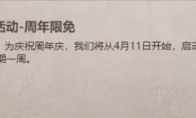 第五人格中的周年庆活动正在如火如荼的进行,其中有一项活动是全角色限免活动,在活动期间玩家可以尽情使用任意游戏角色进行战斗,下面就一起来看看此次限免活动的持续时间吧。<<<<<<小编推荐:第五人格周年庆活动汇总周年庆全角色限免活动时间介绍【活动时间】2019年4月11日-2019年4月17日【活动规则】4月11日起,所有角色限免,持续一周!以上就是关于第五人格周年庆全角色限免活动时间介绍的全部内容啦,想获得更多第五人格的相关攻略可以关注3DM手游网第五人格专区哦,小编将会持续为您更新。