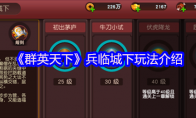 群英天下游戏中有很多特色玩法,其中兵临城下是通过击杀士兵的数量计算收益的玩法。在每个难度中,击杀所有士兵和武将才算当前难度通关,并开启下一难度,并获得额外一次挑战次数,难度越高,击杀数的奖励系数越高,获得的奖励越多。 《群英天下》兵临城下玩法介绍兵临城下是通过击杀士兵的数量计算收益的玩法。在每个难度中,击杀所有士兵和武将才算当前难度通关,并开启下一难度,并获得额外一次挑战次数,难度越高,击杀数的奖励系数越高,获得的奖励越多。每天有1次挑战机会和1次扫次数,并在凌晨5:.00刷新重置次数每次扫按照历史最高击杀数发放奖励(包含所有已通过的难度) 难度等级越高通关奖励越高,所以大家努力升级打怪不是没有回报的 攻打关卡过程中敌人会源源不断的,你不但要对付敌方武将小兵也不能放过,因为如果在规定时间内如果不杀完敌人是不算通