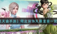 天谕手游中的天册龙音是新上线的限定背饰,相信还有很多小伙伴不是很清楚限定背饰天册龙音怎么样。下面小编给大家带来天谕手游限定背饰天册龙音一览,感兴趣的小伙伴们一起来看看吧。《天谕》限定背饰天册龙音一览每日签到获取昭龙玉,累计签到10天直接获取永久限定背饰【天册龙音】!清新雅致,贵气凛然~以上就是本期关于《天谕》限定背饰天册龙音一览的全部内容了,要想获取更多游戏资讯请点击关注3DM手游网。