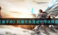 天谕手游中有许多机缘任务,叛逆守序便是其中之一。相信还有很多小伙伴不是很清楚叛逆守序怎么选,下面小编给大家带来天谕手游机缘任务叛逆守序选择建议,感兴趣的小伙伴们一起来看看吧。《天谕》机缘任务叛逆守序选择建议1、香菇菜心在背包选择道具使用喝掉(叛逆)送还给菇舒舒(守序)2、飞驰人生直接跑到终点打卡(叛逆)按部就班依次打卡(守序)3、盗亦有岛必诛之--大声呼救(叛逆)不亦说乎--抓了再说(守序)4、六个老板在武器店段一泉旁边的草丛里(629,394)捡到牌子六个老,然后晚上去三生树下的石碑跪拜(叛逆)按部就班去寻找六位老板,然后晚上去三生树下石碑前跪拜(动作)(守序)5、风水巨贾先去探路,即去三生树下面-钢琴对面-邮筒旁边-的草丛里看到名字特别长的劫匪(307,457)对话战斗,输赢都可以,对战比较困难(叛逆)直接