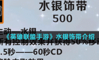 《英雄联盟手游》游戏中水银饰带怎么样?相信玩端游的小伙伴们对这件装备一定不会陌生,面对敌人控制技能较多时,都选择出这件装备来解除控制,那么接下来小编为大家带来《英雄联盟手游》水银饰带介绍,一起来看看吧。 《英雄联盟手游》水银饰带介绍名称: 水银饰带售价: 500唯一主动——水银: 移除所有控制效果并获得50%移动速度持续1.5秒——60秒CD。无法移除击飞效果。 以上就是小编整理的关于《英雄联盟手游》水银饰带介绍的全部内容,更多游戏攻略请持续关注3DM手游网!