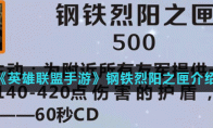 《英雄联盟手游》游戏中钢铁烈阳之匣怎么样?钢铁烈阳之匣是一件辅助性装备,适合辅助英雄出,为队友们增加护盾,那么接下来小编为大家带来《英雄联盟手游》钢铁烈阳之匣介绍,一起来看看吧。《英雄联盟手游》钢铁烈阳之匣介绍名称: 钢铁烈阳之匣售价: 500唯一主动 为附近所有友军提供一个可吸收140-420点伤害的护盾,持续2.5秒——60秒CD以上就是小编整理的关于《英雄联盟手游》钢铁烈阳之匣介绍的全部内容,更多游戏攻略请持续关注3DM手游网!