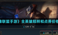 《英雄联盟手游》游戏中英雄皮肤多少钱?相信很多小伙伴都在关注英雄联盟手游中英雄或者皮肤的价格是多少,根端游比起来手游上的价格会是一样的吗,那么接下来小编为大家带来《英雄联盟手游》全英雄精粹和点券价格汇总,一起来看看吧。 《英雄联盟手游》全英雄精粹和点券价格汇总1、游戏中所有的英雄价格都是5500蓝色精粹。2、当然如果玩家是氪金大佬,那么也可以花费725点券购买。 3、而且游戏中有一些英雄是玩家完成任务解锁获得的。4、例如初始时玩家可以选择一些常见的英雄,例如:盖伦、机器人等。5、就拿目前游戏中正在进行的活动来说,玩家等级达到2级时,即可解锁阿狸,4级时即可解锁剑圣。6、目前游戏中上线了第一批英雄,不排除后续会上线价格更高的英雄。7、相较于英雄,皮肤的价格档次区分就多了,525/725/990各种档次的都有,而且