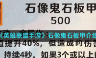 《英雄联盟手游》游戏中石像鬼石板甲怎么样?相信玩过端游的小伙伴们对这件装备一定不会陌生,那么这件装备在手游中发挥怎样的作用呢,接下来小编为大家带来《英雄联盟手游》石像鬼石板甲介绍,一起来看看吧。 《英雄联盟手游》石像鬼石板甲介绍名称: 石像鬼石板甲售价: 500唯一主动——金属化: 生命值提升40%,但造成的伤害减少60%,持续4秒。如果3个或以上的敌方英雄在附近,那么生命值的提升幅度变为100%——45秒CD。 以上就是小编整理的关于《英雄联盟手游》石像鬼石板甲介绍的全部内容,更多游戏攻略请持续关注3DM手游网!