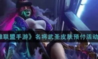 《英雄联盟》手游中的名将武圣皮肤预付活动是新上线的活动,那么英雄联盟手游名将武圣皮肤预付活动内容是什么呢?相信还有很多小伙伴不知道,下面是3DM手游小编给大家分享的英雄联盟手游名将武圣皮肤预付活动介绍,感兴趣的小伙伴们一起来看看吧。 名将武圣皮肤预付活动介绍【活动介绍】 1、名将武圣皮肤预付活动将在11月29日~12月3日期间解锁,届时小伙伴们可以预付60点券参与活动。2、通过参与该系列活动,玩家可在购买名将武圣赵云·赵信、关羽·泰达米尔皮肤时抵扣120点券,最低330点券即可获得其中的一款。并且,倘若玩家同时预定两款皮肤即送额外头像框骑士之环。3、赵信和泰达米尔在游戏内的强度是毋庸置疑的,用好了轻松秀翻全场,获得不俗的战绩。 以上就是小编带来的英雄联盟手游名将武圣皮肤预付活动介绍的全部内容,更多相关资讯,请关