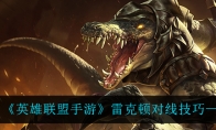 在英雄联盟手游中有很多小伙伴都很想知道游戏中的雷克顿应该怎么对线,今天小编给大家带来了《英雄联盟手游》雷克顿对线技巧一览,感兴趣的小伙伴一起来看看吧,希望可以帮助到大家。《英雄联盟手游》雷克顿对线技巧一览1级学Q,2级学W (W可重置普攻) ,3级学E出门]对线只要不是打远程,基本上稳抢2级,第一个Q尽量连人带兵一起打到,对面如果不走,可以第二个Q瞬间抢2级W打爆发,基本上对线特别强,注意控制怒气,压得好A掉小兵也可以自己完成塔下强杀,团队需要也可以出肉。打团的话一定要注意进场时机,武能优势切C位,文能劣势抗伤害。以上就是小编整理的关于《英雄联盟手游》雷克顿对线技巧一览的全部内容,更多游戏攻略请持续关注3DM手游网!