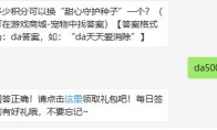 多少积分可以换“甜心守护种子”一个?这是天天爱消除3月11日每日一题题目,相信很多玩家都还不知道今天题目的答案是什么吧?下面给大家带来了天天爱消除3月11日每日一题正确答案,一起来看看吧。>>>>>《天天爱消除》每日一题答案大全天天爱消除3月11日每日一题题目:多少积分可以换“甜心守护种子”一个?正确答案:da50000 或 da5万玩法介绍:天天爱消除微信里面的每日一题相信很多玩家们每天都会准时参与了,每天回答正确就可以获得一次幸运大转盘抽奖资格,可获得积分、金币和宠物等好礼,还等什么呢,赶快加入吧!
