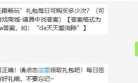 “无限畅玩”礼包每日可购买多少次?这是天天爱消除4月2日每日一题题目,相信很多玩家都还不知道今天题目的答案是什么吧?下面给大家带来了天天爱消除4月2日每日一题正确答案,一起来看看吧。>>>>>《天天爱消除》每日一题答案大全天天爱消除4月2日每日一题题目:“无限畅玩”礼包每日可购买多少次?正确答案:da2玩法介绍:天天爱消除微信里面的每日一题相信很多玩家们每天都会准时参与了,每天回答正确就可以获得一次幸运大转盘抽奖资格,可获得积分、金币和宠物等好礼,还等什么呢,赶快加入吧!