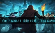 《地下城堡2: 黑暗觉醒》是一款模拟经营与地牢探险游戏。游戏中遗迹15已经上线一段时间了,遗迹15一共分为7天讲解,每一天的攻略都很清晰哦,那么遗迹15第三天怎么过关呢?下面是3DM小编给大家带来的《地下城堡2》遗迹15第三天阵容攻略,感兴趣的小伙伴们一起来看看吧。《地下城堡2》遗迹15第三天阵容攻略今日目标:收掉巫医、传法,磨血祭祀远征券:使用6票;昨天有4票献祭,再送2空票挑战队伍:铁壁小队药剂:选择普通药剂【状态效果+10%】阵容配置:技能设置:● 烈枪:当前血量最低,始终破甲狙击● 祭祀:始终奶● 狂战:当前血量最低,始终乾坤一击● 夜莺:当前血量最低,选择一、三技能阵容配置说明:1:本次阵容为遗迹15毕业配置,参考阵容不代表最佳阵容,低配请根据怪物属性自行调整。2:因为地堡每个人的配置不一样,所以本攻