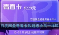 百度网盘中有一个超级会员青春卡的活动,相比直接开通超级会员,价格会更低一些,所以对于有需要的小伙伴来说,就想要开通这个青春卡试试看。那么百度网盘青春卡和超级会员一样吗?具体有什么区别呢?下面小编为大家带来了相关介绍,我们一起来看看。百度网盘青春卡和超级会员一样吗?1、此次百度网盘推出的超级青春卡实际上相当于是超级会员的折扣版,在提供的会员权益方面与超级会员并无区别。2、例如提供5TB的存储空间、不限速下载、在线解压、视频倍速播放等权益,只是价格方面比超级会员要稍便宜些。3、例如百度网盘超级会员正常销售价格是298元/年,而超级青春卡是229元/年,相当于是超级会员正常价的7.7折。4、要享受这7.7折优惠的话必须经过实名认证并且年龄在16~25 周岁之间,在此范围之外的话是无法购买青春卡的。“超级青春卡”提供了