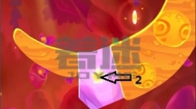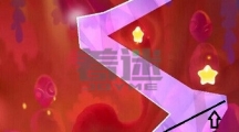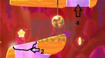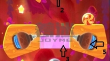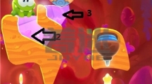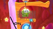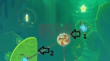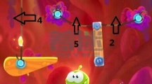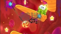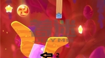 先沿着线条1划掉左边的冰块成功利用boss的法术获得第一颗星星,接着沿着线条2划掉以下的所有冰块,利用boss的法术抓住时机割断糖果的绳子使其成功到达木块的那层位置。 糖果会推动木板,当木块到达圆圈位置时割断箭头1的绳子,接着更换主角形态它会通过时空隧道。 可以利用主角推倒boss,接着划掉主角下方的冰块成功吃掉糕点。