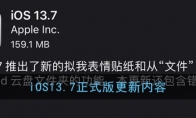 9月2日,苹果公司推送了iOS13.7正式版。据了解,iOS13.7可能会是iOS13系统的最终稳定版本,因此在iOS13.7版本中没有加入太多新功能,主要是以系统稳定为主。iOS13.7都更新了什么?下面就跟小编一起来看看iOS13.7正式版更新内容吧! iOS13.7更新了什么?iOS13.7推出了新的拟我表情贴纸和从文件App共享云盘文件夹的功能,本更新还包含错误修复和改进。另外本次还增加了COVID-19“暴露通知”系统。苹果官方介绍称,iOS13推出的“深色”模式为iPhone带来了全然不同的新风格,提供了浏览和编辑照片的全新方式,并新增了保护隐私的登录方式,轻点一下即可登录App和网站。iOS13速度更快、响应更迅速。系统经整体优化后,App启动速度提升、App下载大小缩减,同时面容ID也变得更快。