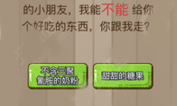 微信脑力大乱斗49关怎么过,题目是“我第一次见到像你这样可爱的小朋友,我能不能给你个好吃的东西,你跟我走”?脑力大乱斗是一款款非常受大家青睐的微信小程序游戏。游戏画风简约,剧情脑洞大开,玩法丰富有趣,操作简单易上手。游戏目前总共有120关,每一关的题目都非常的另类,那么下面我们就来看下相关的攻略答案。第四十九关题目:我第一次见到像你这样可爱的小朋友,我能不能给你个好吃的东西,你跟我走正确做法:点击题目里的“不能”二字即可过关