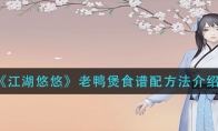 江湖悠悠老鸭煲怎么做?在游戏内很多玩家都想知道,老鸭煲的制作需要哪些材料。下面就让小编给大家带来《江湖悠悠》老鸭煲食谱配方法介绍,感兴趣的小伙伴们一起来看看吧。《江湖悠悠》老鸭煲食谱配方法介绍配方:禽肉 + 白萝卜 + 冬瓜 + 竹笋前往偏好:东方(徐州、青州)简介南京人爱吃鸭肉,是出了名的,民间更有“无鸭不成席”的说法。而老鸭煲,就是其中一道非常有代表性的菜肴。制作老鸭煲时,需选择春天的麻鸭,肥而不腻。而煮汤时则要选陶罐,汤清味浓。此外,还需在汤中加入酸萝卜、火腿、香菇等辅料,尝之方可回味无穷。喂养宠物可获得的亲密度优品/极品/绝品/神品380\456\570售价优品/极品/绝品/神品无\1505\2258\3010食材获取:禽肉:携带美食【出行】,在九州游历途中遇到【打猎】事件时概率性获得。【施舍春】每日会