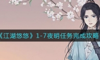 江湖悠悠1-7夜明怎么过?《江湖悠悠》游戏中1-7夜明任务很多玩家不知道如何完成,那么今天小编就给大家介绍一下江湖悠悠1-7夜明任务完成攻略,有需要的小伙伴不要错过了。《江湖悠悠》1-7夜明任务完成攻略主线任务董大力(7-3024-1000)奖励:获得铜钱500,情义值85、铜钱500、突破丹2个。和山涧老人对话2次奖励:绳索不断绳索,打败黑衣探子丙(8-3213-1000)奖励:劣品解僵针2个。斩断绳索,需要在山洞度过一个晚上;奖励:情义值125、铜钱700、突破丹2个。支线任务支线任务①:找到张君瑞,用轻功上山,然后给他道具;奖励:纸鸢和手帕,情义值100。支线任务②:打败无忧小和尚(2-577-1000)奖励:劣品馒头1个打输了奖励:突破丹2个、情义值15支线任务③:打败王苏阳(8-3213-1000)奖