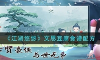 江湖悠悠文思豆腐怎么做?在游戏内很多玩家还不清楚,文思豆腐的制作方法是什么。下面就让小编给大家带来《江湖悠悠》文思豆腐食谱配方,感兴趣的玩家一起来看看吧。《江湖悠悠》文思豆腐食谱配方【食谱配方】 类型:食谱食材配方:禽肉,黄豆,水,黄豆以上就是《江湖悠悠》文思豆腐食谱配方的全部内容了,更多手游攻略请关注3DM手游网!