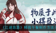 在江湖悠悠中有很多小伙伴都比较好奇精致午餐应该怎么解锁,今天小编给大家带来了《江湖悠悠》精致午餐制作方法介绍,还不知道精致午餐怎么解锁的小伙伴一起来看看吧,希望可以帮助到大家。《江湖悠悠》精致午餐制作方法介绍1、东安子鸡:禽肉、辣椒、生姜、葱2、北京烤鸭:禽肉、小麦、胡椒、黄瓜3、姜丝鸭煲:禽肉、生姜、生姜、水4、灼鱼:鱼、鸡蛋、辣椒、芝麻5、灼鸡:禽肉、鸡蛋、辣椒、芝麻6、炙双鲜:禽肉、鱼、胡椒、辣椒7、炮燔:禽肉、胡椒、黄瓜、土豆8、烤鱼:鱼、胡椒、辣椒、芝麻9、烤鸡:禽肉、胡椒、辣椒、芝麻10、白斩鸡:禽肉、生姜、生姜、葱11、胡椒酱:胡椒、胡椒、生姜、水11、臭鳜鱼:鱼、辣椒、葱、生姜13、西湖醋鱼:鱼、生姜、生姜、葱14、酒糟鱼:稻谷、芝麻、鱼、辣椒15、鱼面:鱼、小麦、鱼、鱼16、鱼鲊:鱼、稻谷、胡