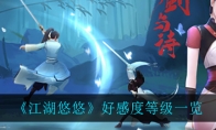 在江湖悠悠中有很多小伙伴都比较好奇游戏中的好感度分为几个级别,今天小编给大家带来了《江湖悠悠》好感度等级一览,感兴趣的小伙伴一起来看看吧,希望可以帮助到大家。《江湖悠悠》好感度等级一览1、萍水相逢(1-99)2、泛泛之交(100-199)可看好友生日信息3、一见如故(200-299)可看好友庭院,但暂无可进行的互动4、结伴同游(300-499)解锁好友角色间的实体形式互动,自此可以开始以送花、切磋的形式获取好感和铜钱,还可以随手给好友盖章(此行为不加好感)5、肝胆相照(500-799)6、莫逆之交(800-999)7、契若金兰(1000-1499)8、情同手足(1500-?)以上就是小编整理的关于《江湖悠悠》好感度等级一览的全部内容,更多游戏攻略请持续关注3DM手游网!