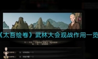 《太吾绘卷》游戏中一场僵持良久的比武正在会场当中进行,太吾亦在一旁观望……那么观望会起到什么作用呢?武林大会观战能够触发聪颖性格,今天小编就给大家介绍一下太吾绘卷武林大会观战作用一览,有需要的小伙伴不要错过了。 《太吾绘卷》武林大会观战作用一览武林大会观战的触发时机是聪颖格 一场僵持良久的比武正在会场当中进行,太吾亦在一旁观望……只见双方一个攻的巧妙,一个守的严密,可谓旗鼓相当,难分高下……凝神观战从比武的两人中随机选取一类功法进行判定,需要太吾本人对应的 “造诣与奇遇所食食物附加造诣之和” 大于对方对应的造诣若成功——“二人你来我往,各显其能,生平所学俱已发挥的淋漓尽致!太吾凝神观望,忽然灵光一现,竟似窥破天机,对方的一招一式由何处生,往何处去,在太吾眼中,再无秘密!”再次随机从对方所学品级最高的功法中获得一